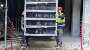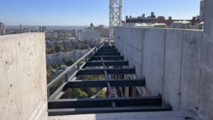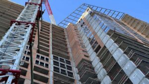 Second section: installation of window structures on floors 14–16 continues, elevators are being installed. Masonry of ventilation ducts has been completed, work on roof waterproofing continues.